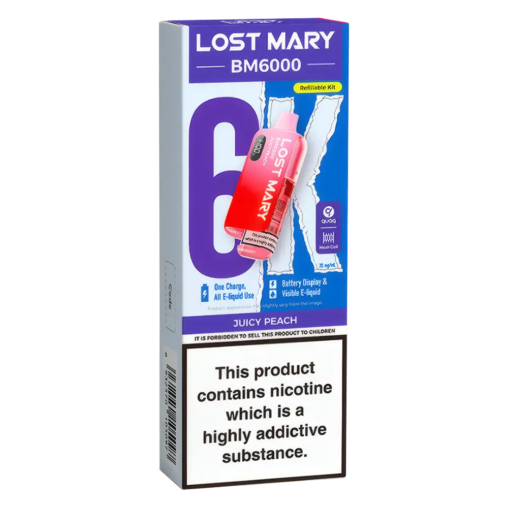 Juicy Peach Lost Mary BM6000 is all about simplicity and sweetness. Each puff is dripping with ripe peach flavour that’s smooth, mellow, and naturally delicious. Enjoy up to 6000 puffs with this rechargeable and TPD-compliant pod kit—a great pick for fruit lovers. Grab Lost Mary prefilled pod kit solo or mix it into your 5 for £50 bundle.