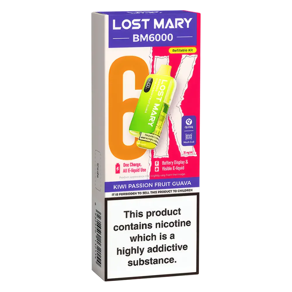 Kiwi Passionfruit Guava Lost Mary BM6000 has a unique and stylish look with the pod tank provided on the side. The amount of e liquid left in this pod tank is visible, helping you track your vaping habit and e liquid used. New Lost Mary vapes now allow you to recharge the device with 1000mAh and fast charging capacity. The device is completely legal and TPD-compliant in the UK market. When e liquid runs out, simply insert a new set of Lost Mary BM6000 Pods and continue vaping.