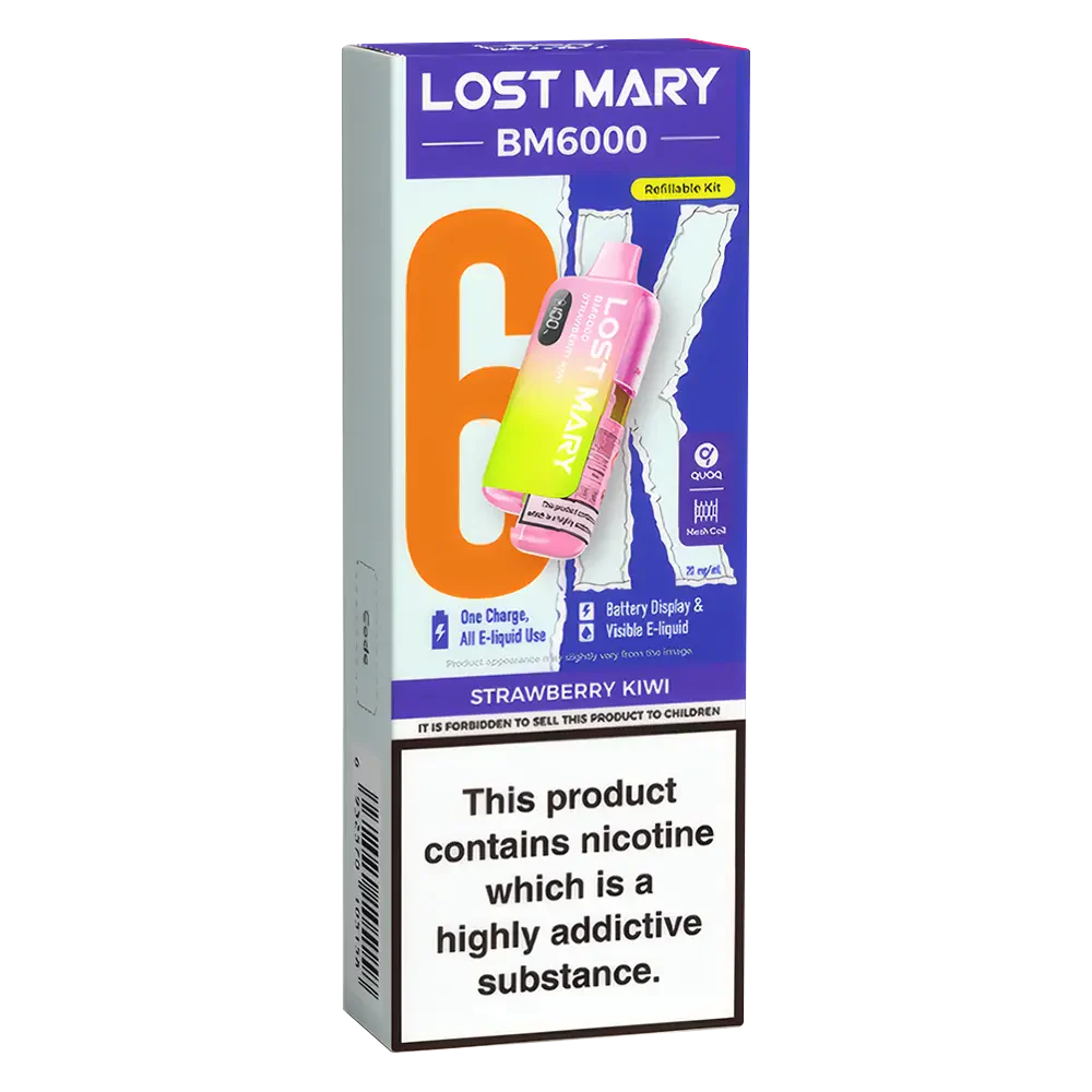 Strawberry Kiwi Lost Mary BM6000 is a fruity fusion of sweet strawberry and tangy kiwi, creating a smooth, juicy vape that’s both sweet and sharp. With 6000 puffs and a 1000mAh rechargeable battery, it delivers consistent flavour in a sleek, TPD-compliant device. Get Lost Mary prefilled pod kit as part of our 5 for £50 bundle and enjoy all-day flavour.