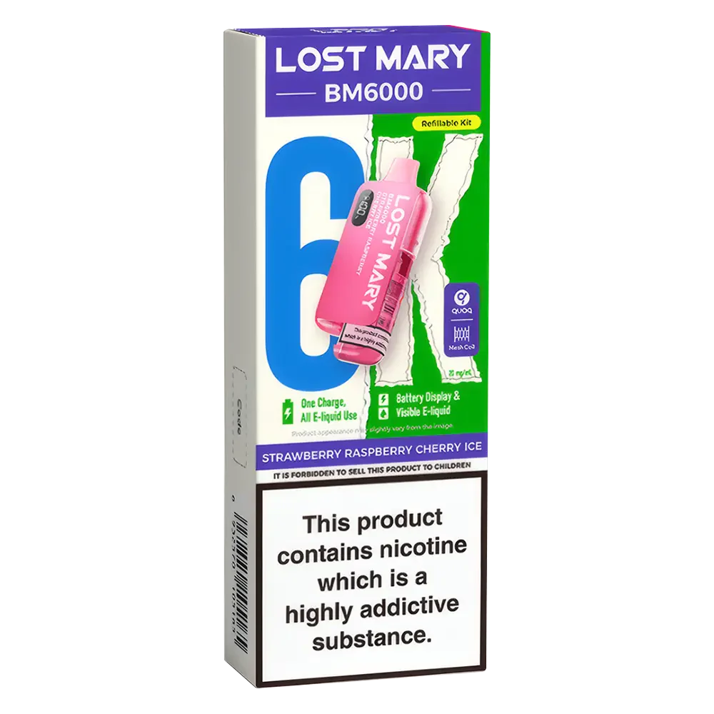 Strawberry Raspberry Cherry Ice Lost Mary BM6000 has a unique and stylish look with the pod tank provided on the side. The amount of e liquid left in this pod tank is visible, helping you track your vaping habit and e liquid used. New Lost Mary vapes now allow you to recharge the device with 1000mAh and fast charging capacity. The device is completely legal and TPD-compliant in the UK market. When e liquid runs out, simply insert a new set of Lost Mary BM6000 Pods and continue vaping.